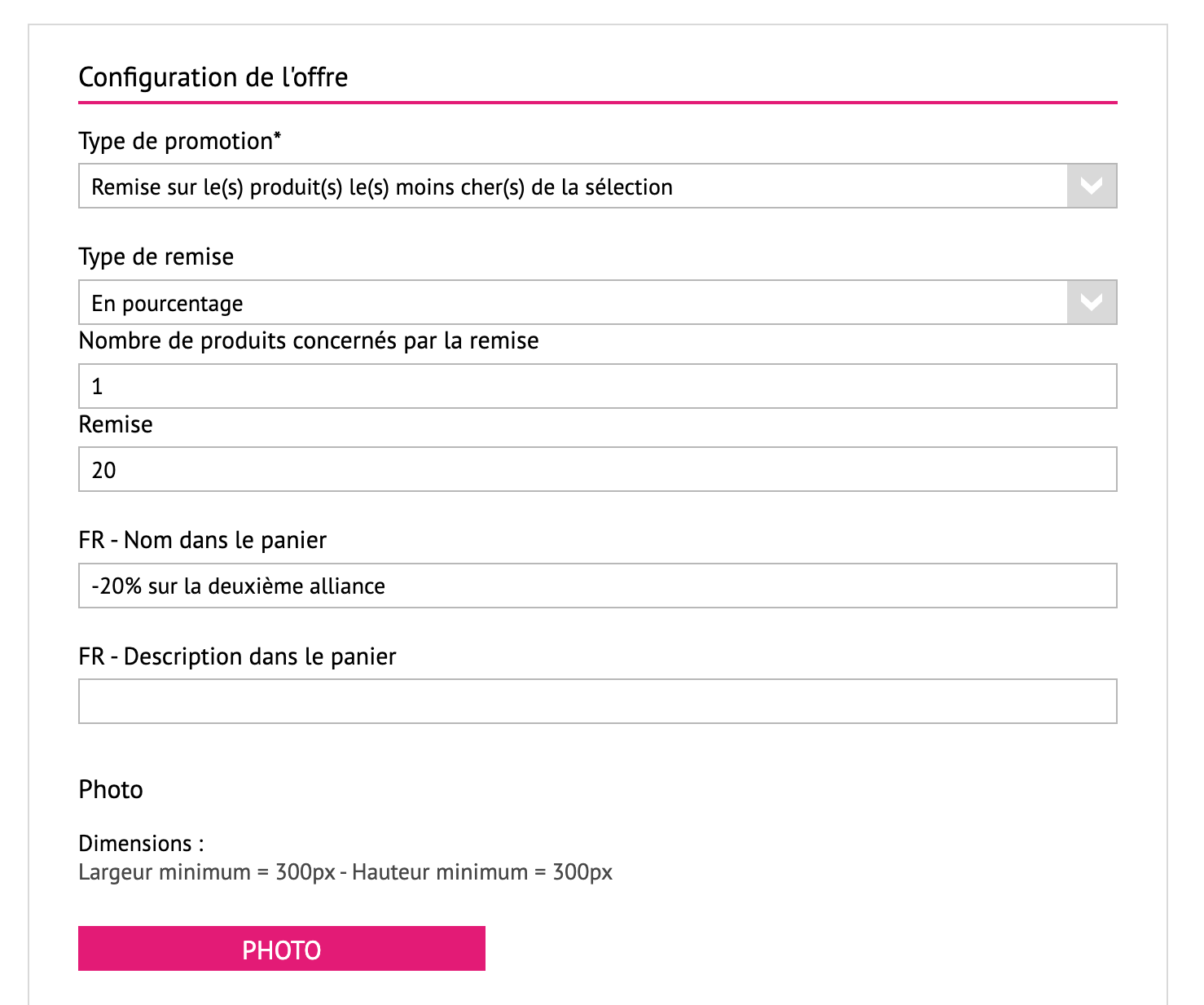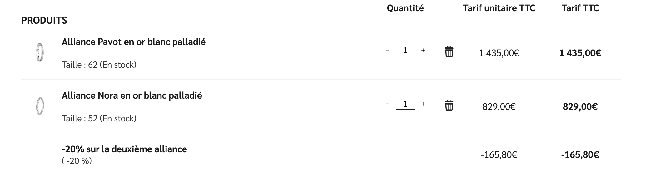 Vous souhaitez proposer une remise sur l'achat d'un deuxième article, par exemple: une offre de -20 % sur une 2ème alliance achetées ? Voici comment y parvenir via votre back-office.
