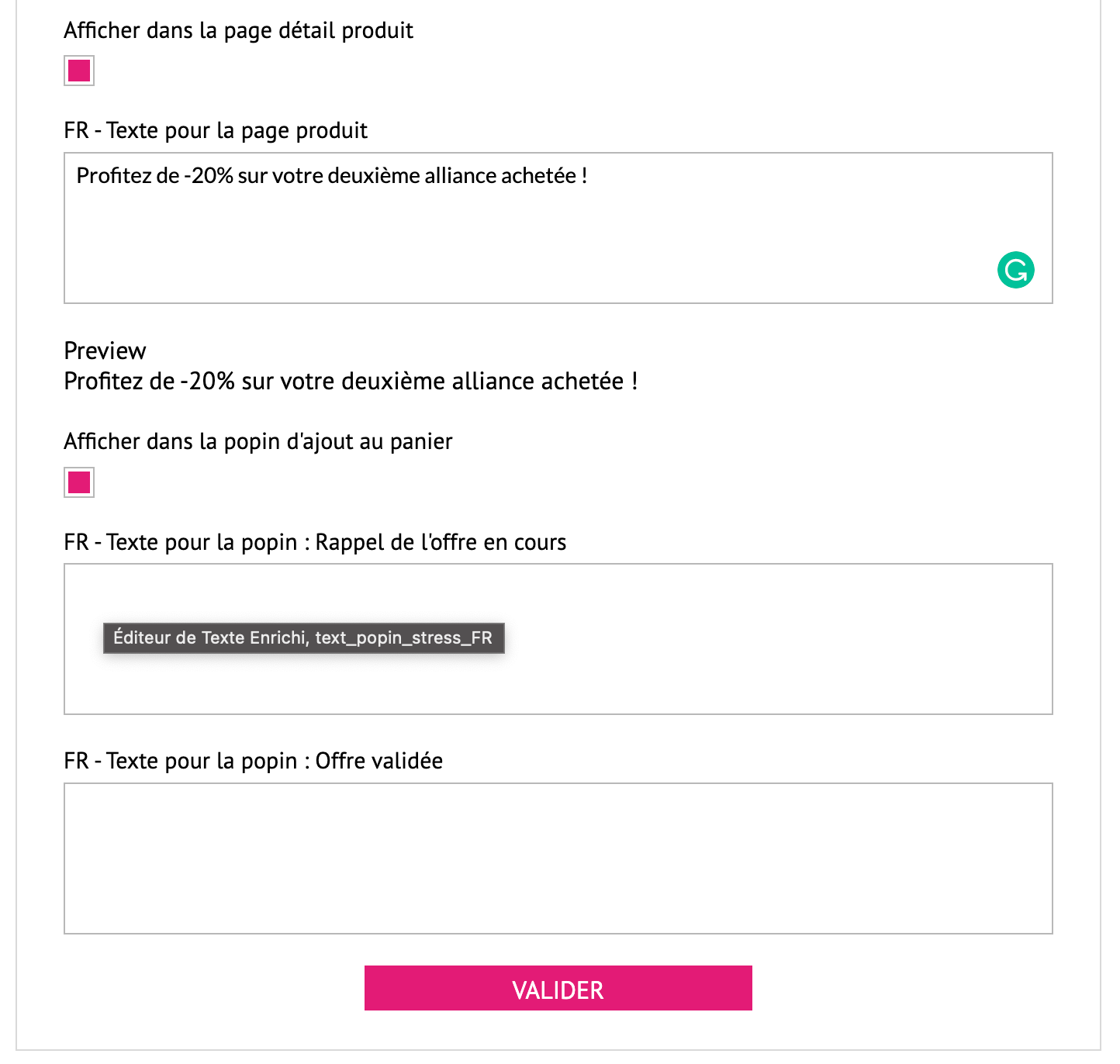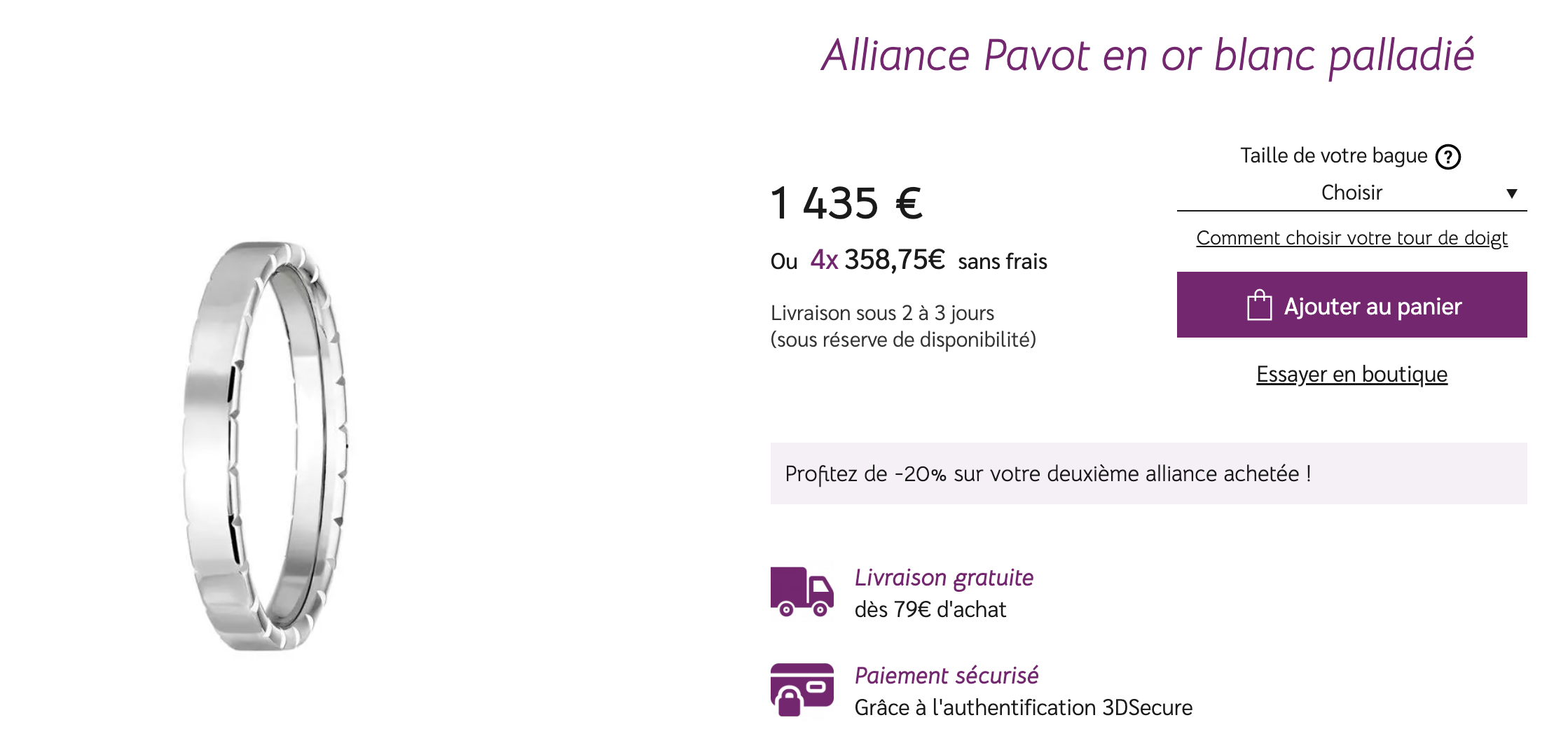 Vous pouvez tout aussi bien afficher un message dans la pop-in d'ajout au panier de l'article. Cela permet d'informer le client qu'il peut ajouter une alliance supplémentaire au panier pour obtenir la validation de l'offre ou bien que l'offre est bien validée et qu'il bénéficie de la promotion dans son panier.