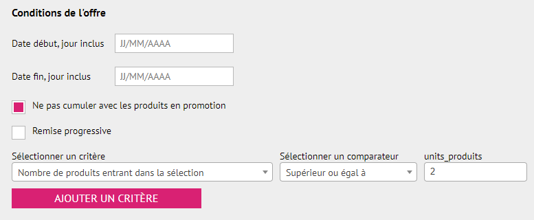 Sélectionnez le critère "Nombre de produits entrant dans la sélection" avec le comparateur "Supérieur ou égal à" puis "2" pour le nombre de produits nécessaire.