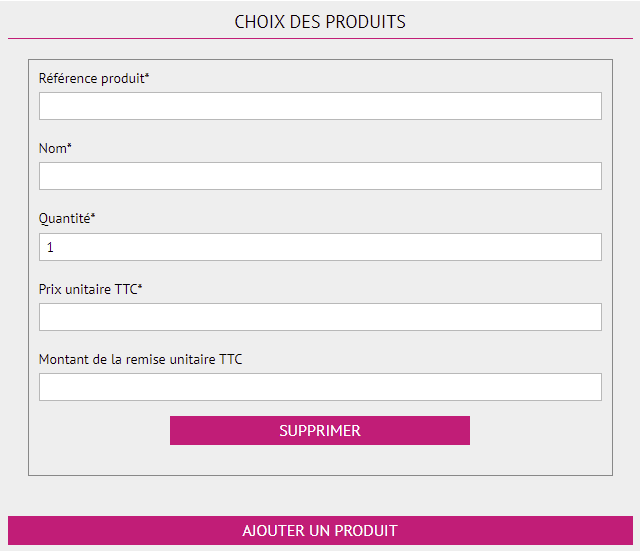 Remplissez les informations sur le/les produits : référence produit, nom du produit, quantité, prix unitaire TTC, remise (il faut saisir le montant de la remise à appliquer).