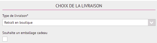 Choisissez ensuite un mode de livraison (retrait magasin/livraison à domicile, ...) ainsi que, si vous le proposez, l'emballage cadeau.