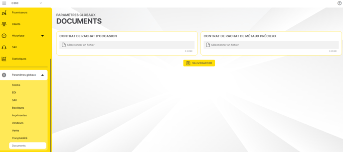 Pour plus de confort et avant d'effectuer un premier rachat, vous pouvez ajouter dans Commerce 360 un modèle de contrat de rachat d'occasion, via la rubrique Paramètres globaux > Documents (optionnel, voir capture d'écran ci-dessous) :