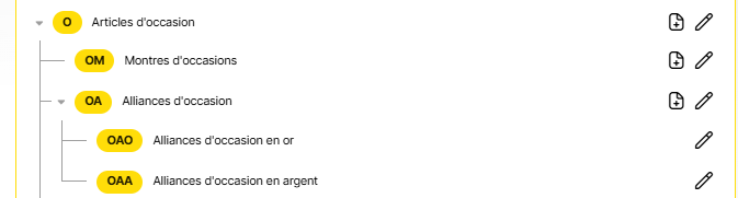 Exemple de structure d'une nomenclature pour objets d'occasion (groupe, famille et sous familles) :