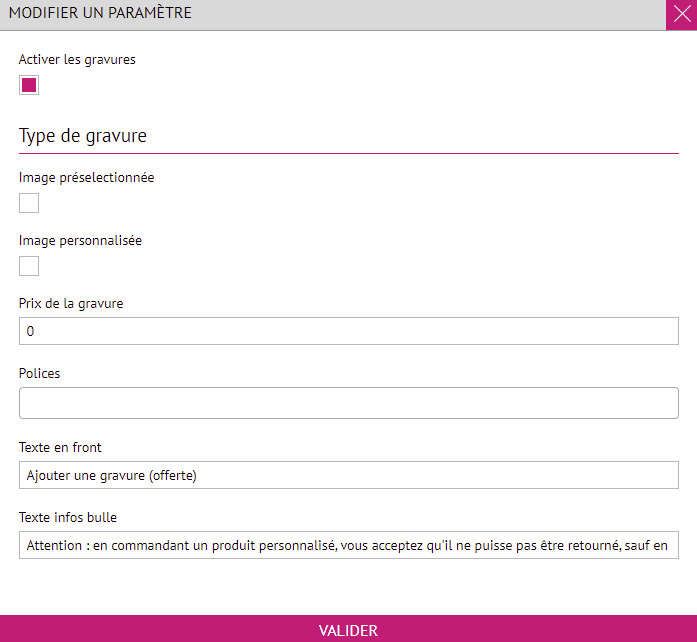 Dans HBJO e-commerce > Paramétrages > Paramètres globaux > Activer/ désactiver les gravures, il est possible d’activer ou de désactiver la gravure, d’en choisir le montant et d’inscrire les labels de la pop-in. Vous pouvez également choisir d'activer la possibilité d’afficher différents types de gravure avec des images présélectionnées ou des images personnalisées ainsi que les différentes polices de texte pour le texte à graver.