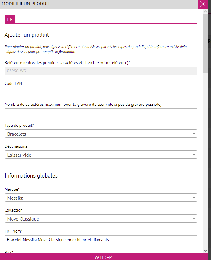Une fois vos paramètres de la gravure remplis, vous pouvez aller dans vos détails produit pour ajouter la gravure sur vos produits concernés ou nous envoyer la liste des produits sur lesquels ajouter la gravure.