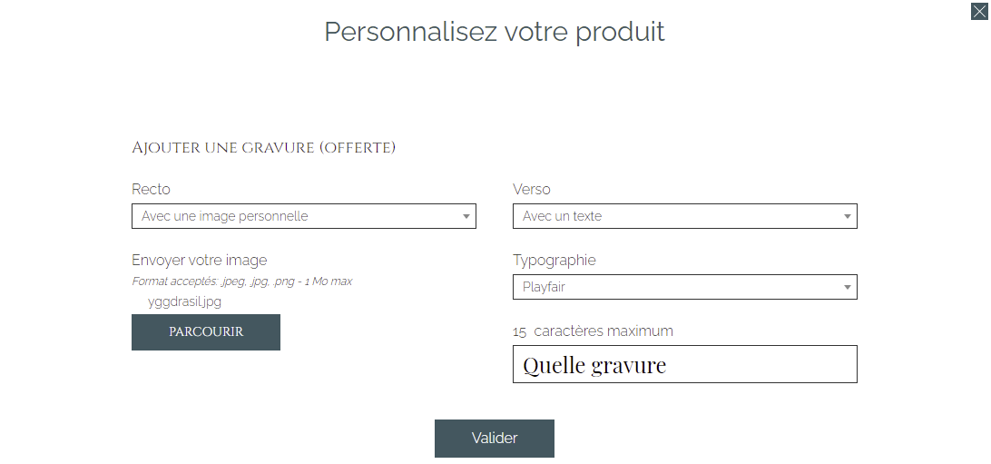 Il est possible de proposer à vos clients de faire graver un ou plusieurs produits, au recto et/ou au verso, ainsi que de paramétrer la typographie. Voyons plus en détails comment cela fonctionne.