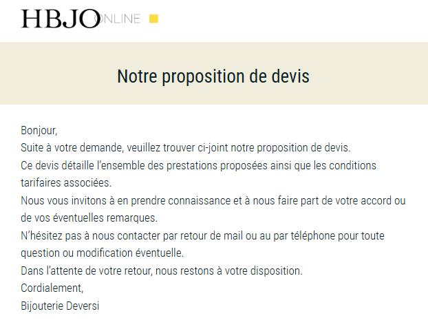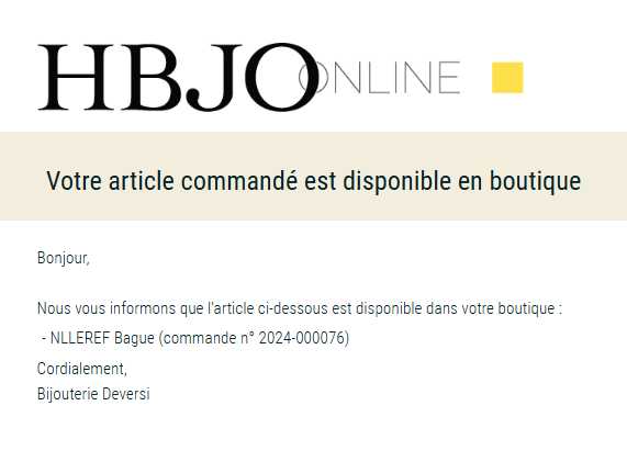 (message modifiable depuis la rubrique Paramètres globaux > Communication, le logo de votre bijouterie remplace celui de hbjo online)