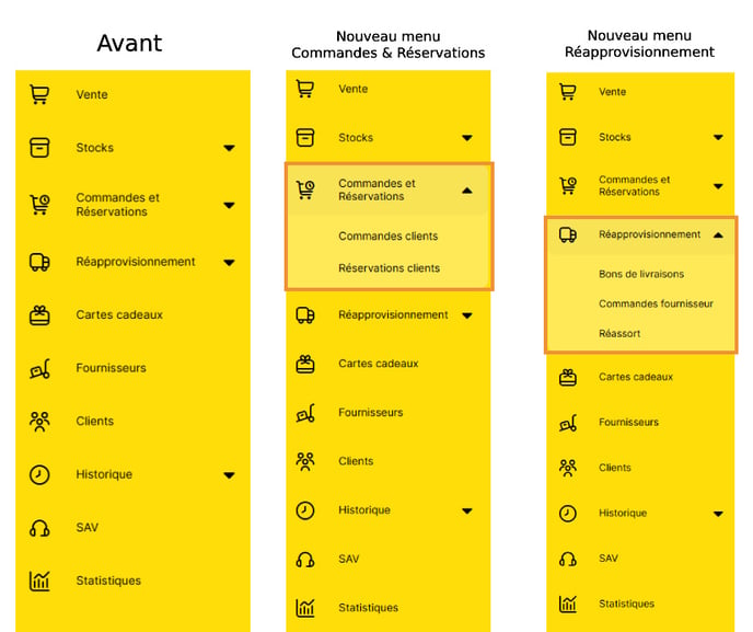 - la rubrique "Réapprovisionnement" est renommée en "Réassort"