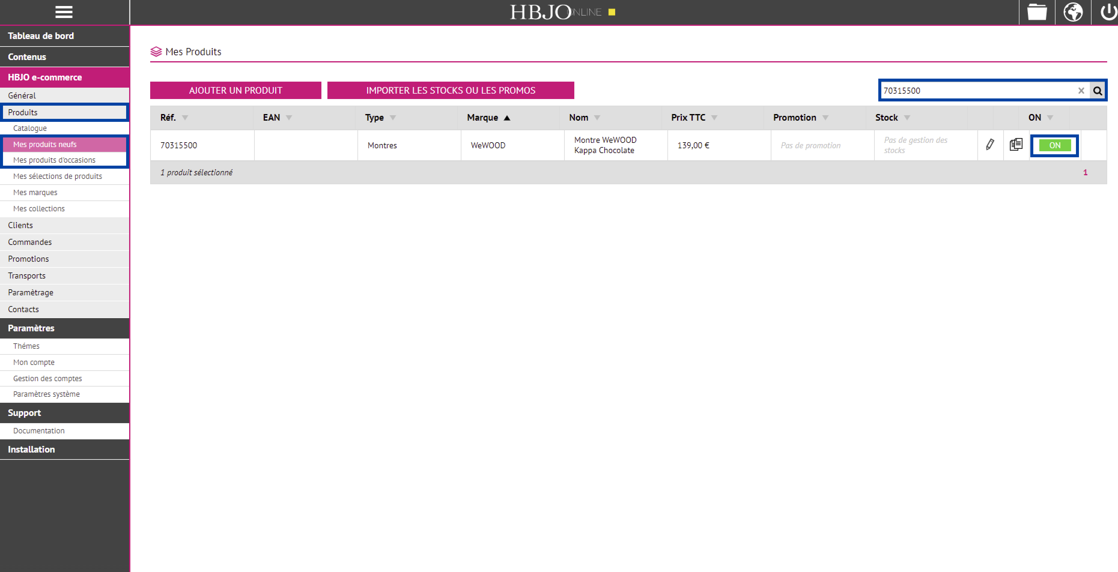 Tapez ensuite la référence de votre produit dans la barre en haut à droite. Quand vous avez enfin trouvé votre produit, cliquez simplement sur le bouton "ON", celui-ci se changera en un bouton "OFF". Cliquez sur "OFF" si vous souhaitez remettre le produit sur votre site.