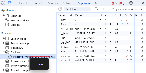 Enfin, cliquez sur "Clear" pour supprimer les cookies de Commerce 360 (uniquement).