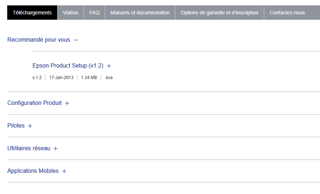 De l'aide pour la configuration du produit et de son réseau, les derniers pilotes d'impressions et d'autres outils sont mis à disposition, voir l'exemple du site d'Epson ci-après :