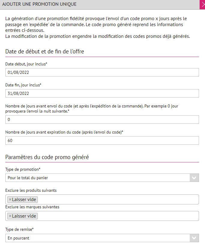 Une pop-in va s’ouvrir avec plusieurs champs. Vous pourrez y choisir le début et fin de l’offre, le nombre de jours avant l’envoi du code, le nombre de jours avant l'expiration du code, les paramètres du code promotionnel et l'écriture de l’e-mail ainsi que l’objet du mail.