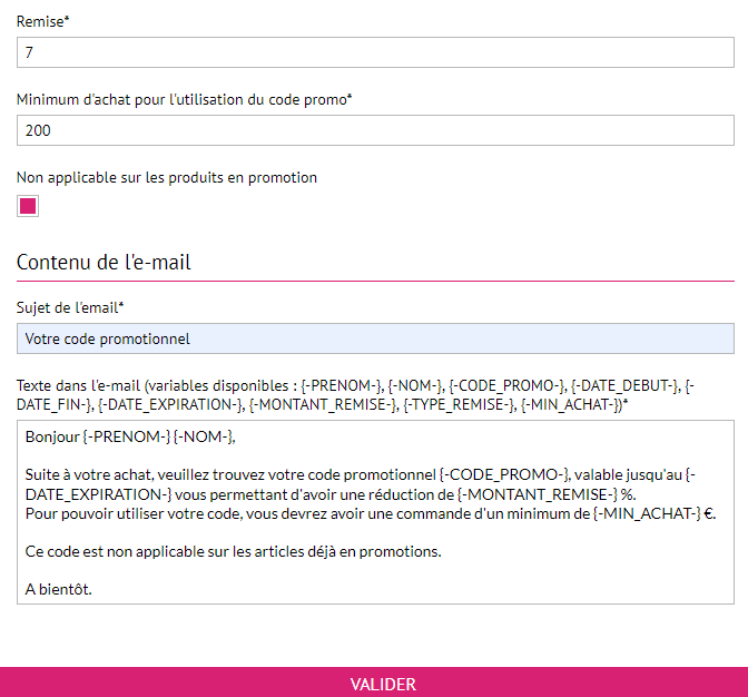 Pour personnaliser votre e-mail, nous vous proposons différentes balises à ajouter, une seule d’entre elles est obligatoire : la balise {-CODE_PROMO-}, qui ajoutera le code promotion dans l’e-mail, cependant, bien que les autres balises ne soient pas obligatoires, nous vous recommandons d’en rajouter certaines :
