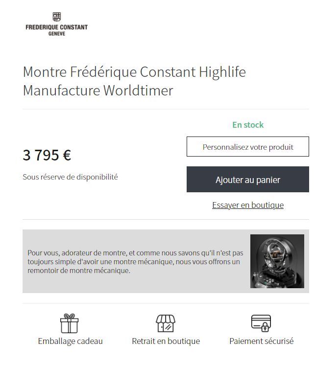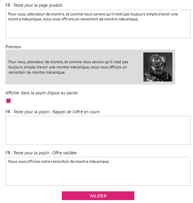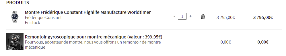 Vous souhaitez créer une offre où un remontoir de montre pour tout achat d'une montre d'une valeur égale ou supérieure à 2 000 € est offert.
