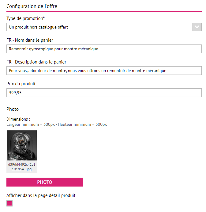 Ensuite, pour configurer l'offre, commencez par ajouter le cadeau. Soit "un produit hors catalogue offert" ou "Un produit du catalogue offert" selon si l'article est disponible dans le back-office. Ici, sélectionnez un cadeau hors catalogue et remplissez les textes et ajoutez une image.