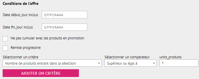 Important : si votre offre de cadeau concerne le montant total du panier, veillez à ne pas compléter la partie "units_produits" avec une valeur à 0. Le panier vide affichera par défaut le cadeau offert et le visiteur pourra passer commande sans acheter d'article.