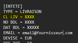 EDI code boutique : là aussi le fournisseur doit le fournir au préalable. Il peut cependant être trouvé au même endroit que précédemment, via la mention "CL LIV ="