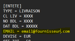Email pour EDI : le fournisseur doit fournir l'adresse d'envoi des EDI. Mais il est possible de trouver cette information, en ouvrant un fichier EDI réceptionné par le fournisseur avec un éditeur de texte (exemple : bloc notes). En haut du fichier il y a une mention "EMAIL =", il s'agit de l'email à saisir sur la fiche fournisseur.